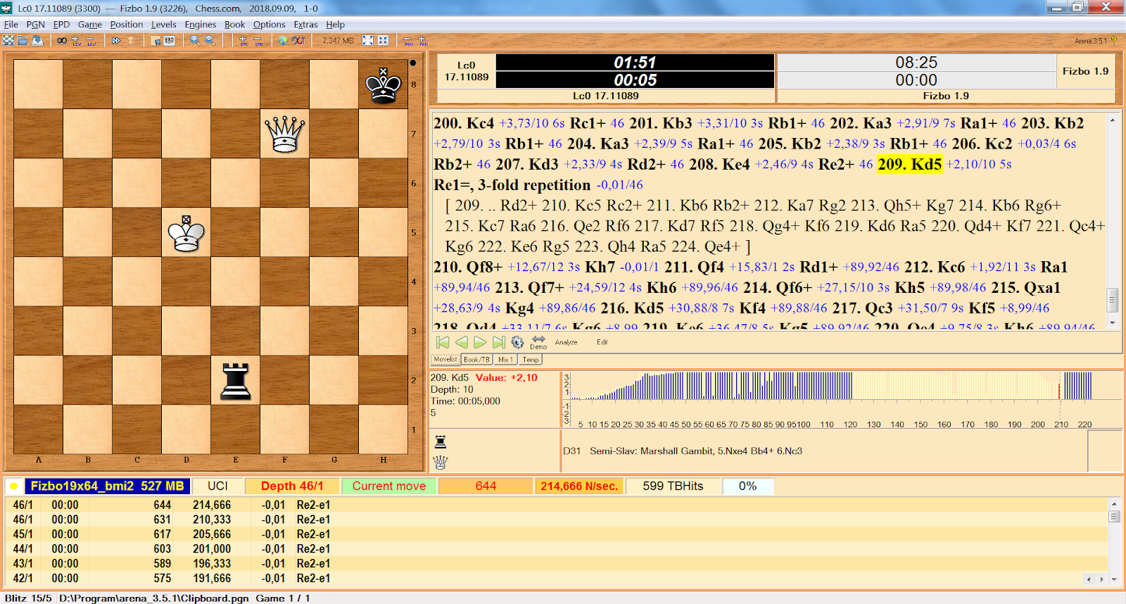 [Event “CCCC 1: Rapid Rumble (15|5) Stage 1”] [Site “Chess.com”] [Date “2018.09.09”] [Round “?”] [White “Leela 11089”] [Black “Fizbo”] [Result “1-0”] [ECO “D31”] [WhiteElo “2400”] [BlackElo “2400”] [PlyCount “221”] [EventDate “2018.??.??”] [EventType “rapid”] [TimeControl “900+5”] 1. d4 d5 2. c4 e6 3. Nc3 c6 4. e4 dxe4 5. Nxe4 Bb4+ 6. Nc3 Nf6 7. a3 Bxc3+ 8. bxc3 Nbd7 9. Nf3 O-O 10. a4 c5 11. a5 b6 12. Bd3 bxa5 13. O-O Bb7 14. Re1 Rc8 15. Ne5 cxd4 16. cxd4 Nxe5 17. Rxe5 Ba6 18. Ra4 Nd7 19. Bg5 Qb6 20. Re1 Qb7 21. Be4 Qc7 22. c5 Rfe8 23. Ra3 Nf8 24. Qa4 Bb7 25. Bf4 Qxf4 26. Bxb7 Rcd8 27. Rd1 Re7 28. Bf3 Ng6 29. g3 Qc7 30. Rb3 Rc8 31. h4 Rd7 32. Rb7 Qxb7 33. Bxb7 Rxb7 34. Qxa5 Ne7 35. Qa6 Rcc7 36. Qa2 Nd5 37. Rb1 h5 38. Rxb7 Rxb7 39. Qa6 Rc7 40. f3 Kh7 41. g4 hxg4 42. fxg4 g6 43. Kf2 Kg7 44. Qb5 Rc8 45. Qb7 Rc7 46. Qb8 Rd7 47. Qb5 Re7 48. Kg3 Rc7 49. Kf3 Kg8 50. Kf2 Kg7 51. Kg3 Rc8 52. Qb7 Rc7 53. Qb5 Rc8 54. Qb7 Rc7 55. Qb8 Rd7 56. Qc8 Nf6 57. g5 Ne4+ 58. Kh3 Rxd4 59. c6 Rd3+ 60. Kg2 Nc3 61. c7 Rd2+ 62. Kh1 Rd1+ 63. Kh2 Rd2+ 64. Kg1 Rd1+ 65. Kh2 Rd2+ 66. Kg3 Rd3+ 67. Kg2 Rd2+ 68. Kf3 Rd3+ 69. Kf2 Rd2+ 70. Ke1 Rd1+ 71. Kf2 Rd2+ 72. Ke3 Rh2 73. Qf8+ Kxf8 74. c8=Q+ Kg7 75. Qxc3+ Kg8 76. Qd4 {This is the play of Leela(white) with 3,4,5,6 TBs with 1.000.000 nodes per move(and around 50.000 to 120.000 TB hits per move) versus SF dev with 3-7 TBs. Up to 80th move the Leela with TBs didn’t deviate. Then, in 80th move Leela with TBs played 80. Qa8+ instead of 80.Qd7 of the real game.} a5 77. Kf3 a4 78. Qxa4 Rh1 79. Kg2 Rb1 80. Qa8+ {Here Leela with TBs deviates and plays Qa8+} (80. Qd7 {Real game on CCCC(Leela with no TBs) went like this…..} Rb2+ 81. Kf3 Rb3+ 82. Kf2 Rb2+ 83. Ke3 Rb3+ 84. Ke2 Rb2+ 85. Kf1 Rb1+ 86. Ke2 Rh1 87. Qd4 e5 88. Qa4 Rh3 89. Kf2 Kg7 90. Qe4 Kg8 91. Kg2 Ra3 92. Qc6 Ra2+ 93. Kg3 e4 94. Qe8+ Kg7 95. Qe5+ Kg8 96. Qxe4 Ra3+ 97. Kg4 Ra6 98. Qe8+ Kg7 99. Kf3 Re6 100. Qc8 Re7 101. Qc3+ Kg8 102. Qc6 Re6 103. Qa8+ Kg7 104. Kf2 Rd6 105. Qa1+ Kg8 106. Ke3 Re6+ 107. Kf4 Kh7 108. Qd4 Kg8 109. Kg4 Kh7 110. Qd8 Kg7 111. Qa8 Rb6 112. Qa1+ Kg8 113. Qa8+ Kg7 114. Qa1+ Kg8 115. Qa5 Rd6 116. Qa8+ Kg7 117. Qa1+ Kg8 118. Qa8+ Kg7 119. Qa1+ Kg8 120. h5 gxh5+ 121. Kxh5 Re6 122. Kg4 Rb6 123. Qa8+ Kg7 124. Qa1+ Kg8 125. Qa7 Re6 126. Qb8+ Kg7 127. Kf5 Ra6 128. Qb2+ Kg8 129. Kf4 Ra4+ 130. Kg3 Ra6 131. Qb8+ Kg7 132. Qe5+ Kg8 133. Qb2 Re6 134. Kf4 Ra6 135. Qb8+ Kg7 136. Qe5+ Kg8 137. Qe8+ Kg7 138. Qc8 Rb6 139. Qc3+ Kg8 140. Qa5 Rd6 141. Qa8+ Kg7 142. Qa1+ Kg8 143. Qa5 Re6 144. Qa3 Rb6 145. Qa8+ Kg7 146. Qa1+ Kg8 147. Kg4 Rb4+ 148. Kg3 Rb3+ 149. Kh4 Rb4+ 150. Kh3 Rb3+ 151. Kh4 Rb4+ 152. Kg3 Rb3+ 153. Kf4 Rb4+ 154. Kf3 Rb3+ 155. Kf4 Rb4+ 156. Kf3 Rb3+ 157. Kf2 Rb6 158. Qa8+ Kg7 159. g6 Rxg6 160. Ke2 Rb6 161. Qa1+ Kg8 162. Qa3 Rb1 163. Qa8+ Kg7 164. Qg2+ Kh8 165. Qh2+ Kg7 166. Qe5+ Kg8 167. Qg5+ Kf8 168. Qd5 Kg7 169. Qg2+ Kh8 170. Qh3+ Kg7 171. Qg3+ Kh8 172. Qc7 Rb2+ 173. Ke3 Rb1 174. Qxf7 Re1+ 175. Kd4 Rd1+ 176. Ke5 Re1+ 177. Kd5 Rd1+ 178. Ke6 Re1+ 179. Kd7 Rd1+ 180. Ke6 Re1+ 181. Kd6 Rd1+ 182. Kc5 Rc1+ 183. Kd4 Rd1+ 184. Kc4 Rc1+ 185. Kd3 Rd1+ 186. Ke4 Re1+ 187. Kd5 Rd1+ 188. Kc6 Rc1+ 189. Kd6 Rd1+ 190. Kc5 Rc1+ 191. Kb4 Rb1+ 192. Kc3 Rc1+ 193. Kd3 Rd1+ 194. Ke2 Re1+ 195. Kd2 Rd1+ 196. Kc3 Rc1+ 197. Kd2 Rd1+ 198. Kc2 Rc1+ 199. Kb3 Rb1+ 200. Kc4 Rc1+ 201. Kb3 Rb1+ 202. Ka3 Ra1+ 203. Kb2 Rb1+ 204. Ka3 Ra1+ 205. Kb2 Rb1+ 206. Kc2 Rb2+ 207. Kd3 Rd2+ 208. Ke4 Re2+ 209. Kd5 Re1 210. Qf8+ Kh7 211. Qf4 Rd1+ 212. Kc6 Ra1 213. Qf7+ Kh6 214. Qf6+ Kh5 215. Qxa1 Kg4 216. Kd5 Kf4 217. Qc3 Kf5 218. Qd4 Kg6 219. Ke6 Kg5 220. Qe4 Kh6 221. Qg4 Kh7 222. Kf6 Kh6 223. Qh3#) 80… Kg7 81. Qa5 Rb2+ 82. Kg3 Rb3+ 83. Kf2 Rb2+ 84. Ke1 Rb1+ 85. Ke2 Rb2+ 86. Kf3 Rb3+ 87. Kf4 Rb1 88. Qc3+ Kf8 89. Qh8+ Ke7 90. h5 Rb4+ 91. Ke3 Rb3+ 92. Kd2 gxh5 93. Qf6+ Kd6 94. Qxf7 Rh3 95. g6 Rh2+ 96. Kd3 Rh3+ 97. Kd4 e5+ 98. Ke4 Rh4+ 99. Ke3 Rh3+ 100. Kf2 Rh2+ 101. Kg3 Rc2 102. g7 Rc3+ 103. Kh4 Rc8 104. Kxh5 Kc6 105. g8=R Rxg8 106. Qxg8 Kd6 107. Kg6 Kc5 108. Kf5 Kd4 109. Qb3 e4 110. Kf4 e3 111. Qxe3+ 1-0