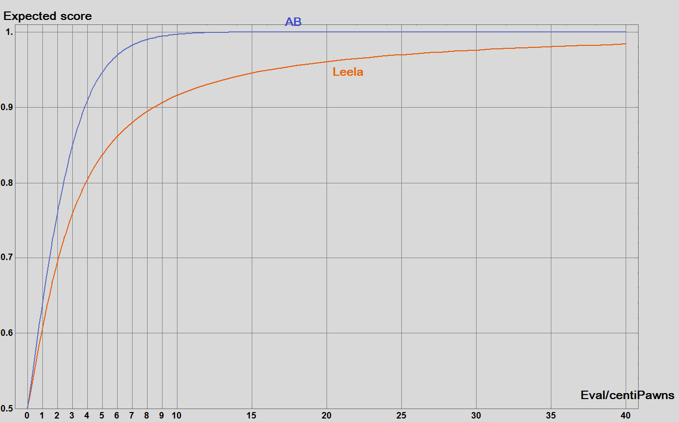 score=ArcTan[centiPawns/2.90680623072]/3.096181612 + 0.5), for translating her